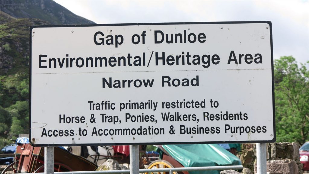 Das Auto bleibt auf dem Parkplatz bei Kate Kearneys Cottage, einem Live-Music-Touri-Pub-und-Restaurant-mit-Gift-Shop. Schilder weisen darauf hin, womit im Talverlauf zu rechnen ist (Engstellen, Brücken, 16% Steigung, Fußgänger, Kutschen, schleudernde Radfahrer,…) und dass der Vekehr hauptsächlich auf Pferdekutschen, Wanderer, Bewohner beschränkt bzw. als Zugang zu Unterkünften oder zu Geschäftszwecken erlaubt ist. Wie wir im Laufe des Tages merken, wird die Formulierung „primarily restricted“ genauso interpretiert wie „Anlieger frei“. Jeder, der hier mit dem Auto fährt, hat schließlich ein Anliegen: er möchte durch das schöne Tal fahren. Eine zeitliche Einschränkung gibt es nicht.