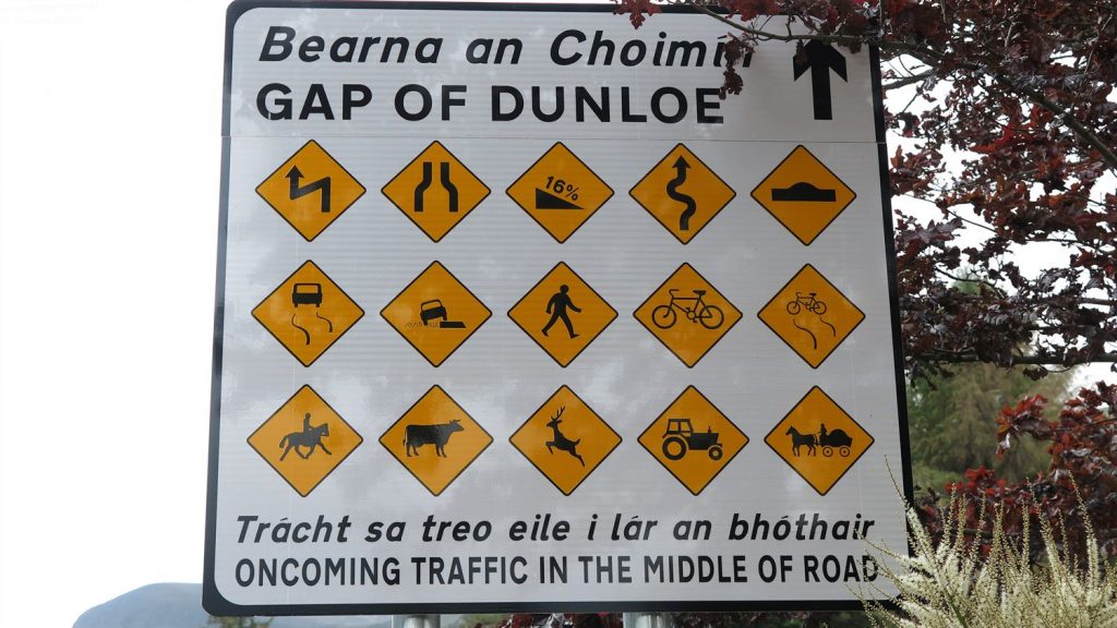 Das Gap of Dunloe, ein schmaler Gebirgspass zwischen den Macgillycuddys Reeks und den Purple Mountains, ist uns von unseren Wirtsleuten als Wanderziel sehr empfohlen worden. Zwar keine lange Tour, aber schön soll es sein. Auch ein Bild von dem Tal des Loe, das, von Gletschern geformt, zum Pass hinauf zieht, hängt in unserem Frühstücksraum. In Tripadvisor lesen wir allerdings so Kommentare wie „Ja, klar ist das ein schönes Fleckchen Erde, aber dadurch, dass man die Strecke mit dem Auto fahren darf (und das nicht nur Einheimische oder Anlieger tun) ist das zum Wandern ungeeignet, auch weil es eine asphaltierte enge Strasse ist, die man gute 10 km entlang läuft.“ Unsere Vermieter versichern uns allerdings, dass Autos nur vor 9 und nach 17 Uhr fahren, da auf der engen Straße nicht genügende Platz sei, um an den tagsüber fahrenden Kutschen vorbei zu kommen. Da wir heute ohnehin nur eine kleinere Tour machen wollen, riskieren wir es.