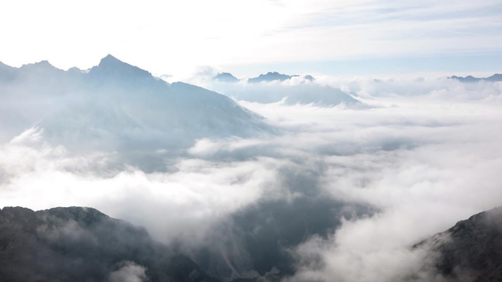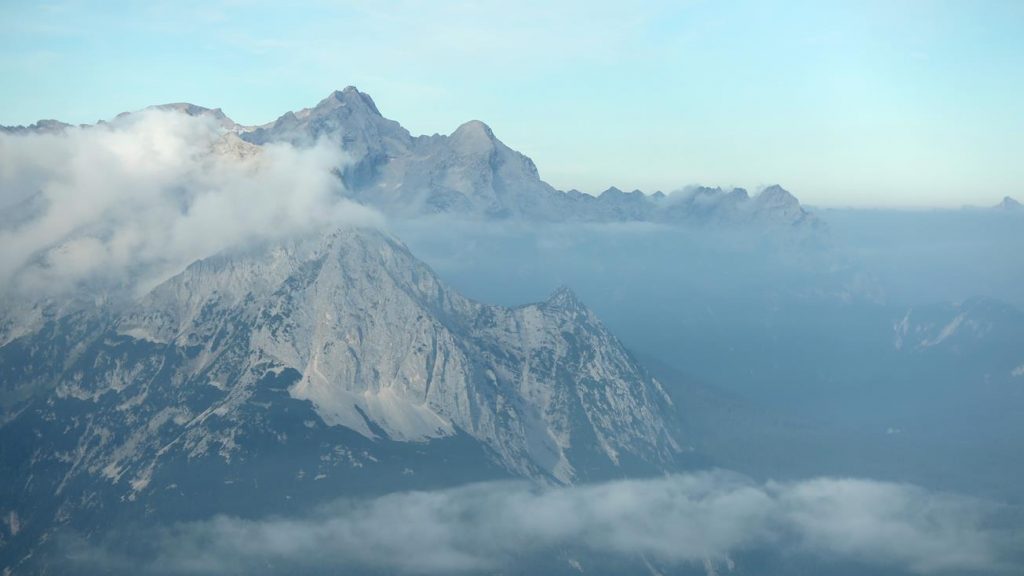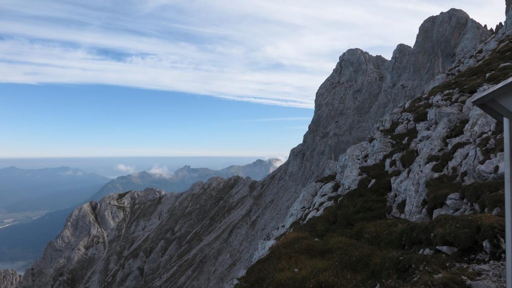Aber wenn man die Leute ausblendet, die ja letztlich lediglich mit demselben Interesse wie wir hierher gekommen sind, kann man die Ausblicke genießen, die sich uns bieten: auf den Wettersteinkamm mit Alp- und Zugspitze, auf die Wolken im Tal und den morgendlichen Dunst, der die Seekarspitzen in seltsame Lichter hüllt, auf die vergletscherten Stubaier Alpen und auf die Häuser und Autos, die klein wie Spielzeug 1.400 Meter unter uns das Isartal bevölkern.