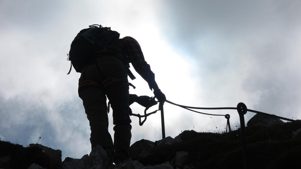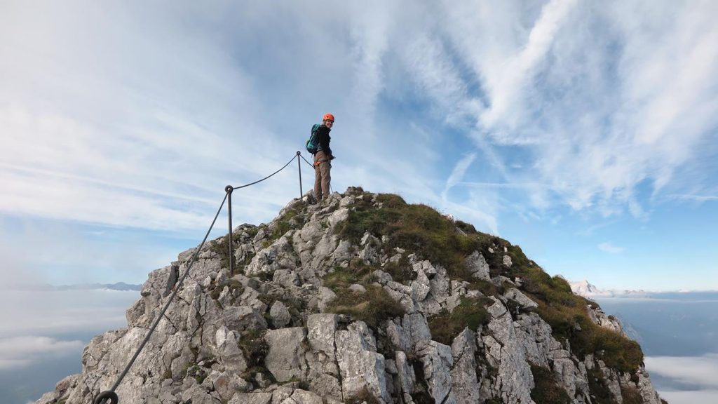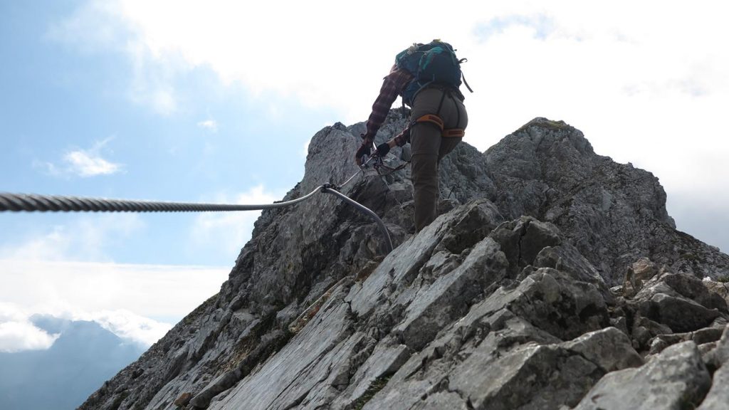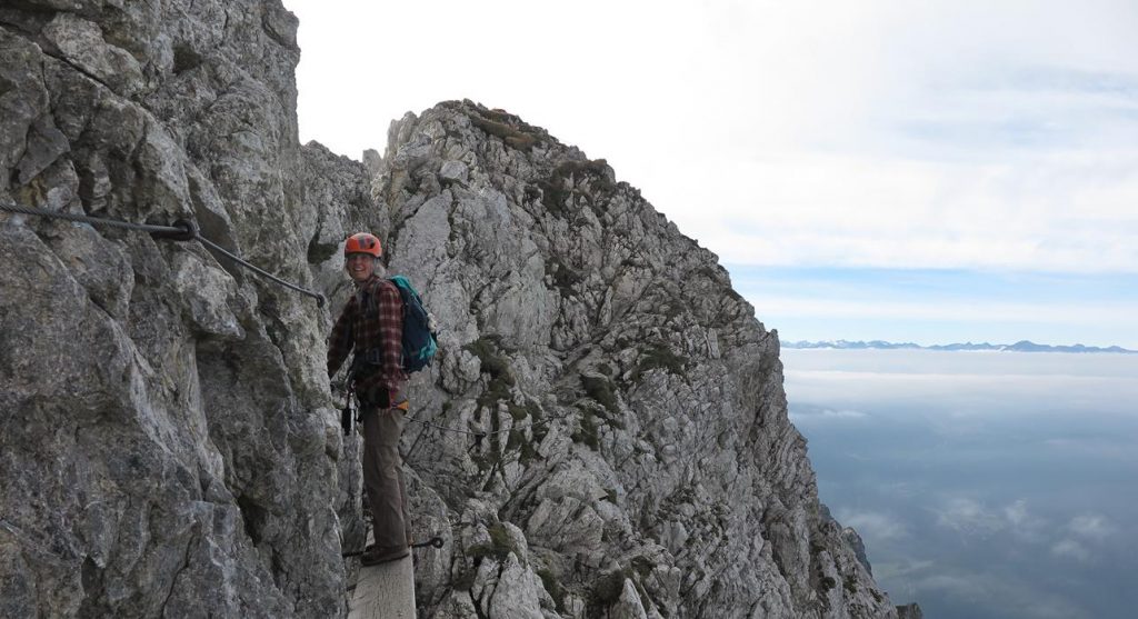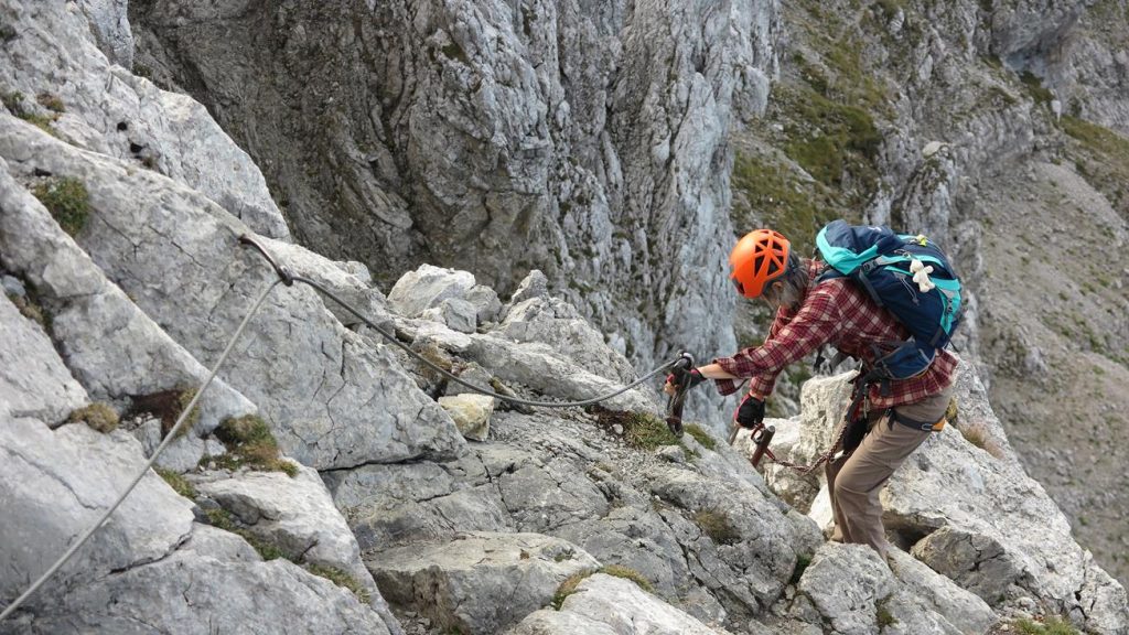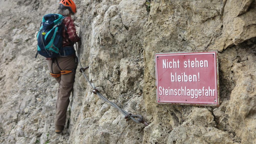 Drei Tage später sind wir wieder da, nachdem wir uns zuvor telefonisch vergewissert haben, dass der Höhenweg heute auch begehbar ist. Apropos: Ist das nun ein Höhenweg oder ein Klettersteig? Nun ja, das kommt mal wieder auf den Betrachter an: Wirklich klettern muss man nicht, dennoch gibt es viele ausgesetzte Wand- und Gratpassagen, die mit Leitern und Drahtseilen abgesichert sind, so dass man sich mittels Klettersteig-Set sichern kann. Für erfahrene, trittsichere und schwindelfreie Geher ist das nicht unbedingt nötig – der Höhenweg wird als Klettersteig der Kategorie A/B gewertet – aber die Grenzen der Belastbarkeit sind immer individuell. Axel Honolds free solo am El Capitan ist dafür ein Extrembeleg, den nachzuahmen für die Wenigsten sinnvoll ist.