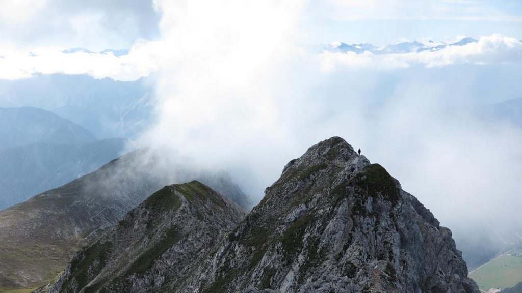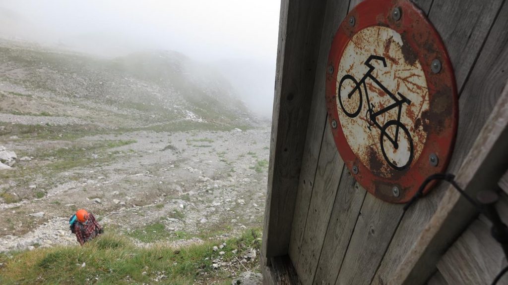 Und der Mittenwalder Höhenweg, millionfach begangen, lohnt sich auch für die eine-million-und-ersten Begeher, die wir wahrscheinlich sind. Fast immer verläuft er auf der Gratschneide entlang, nur einmal weicht der Weg in die Ostseite der Sulzeklammspitze aus. Hier kühlen uns die aus dem Karwendeltal aufsteigenden Wolken ab, der Hinweis „nicht stehen bleiben“ macht in dieser steinschlaggefährdeten Flanke durchaus Sinn! Und das Fahrrad-Verbots-Schild? Zeigt auf jeden Fall Sinn für Humor!