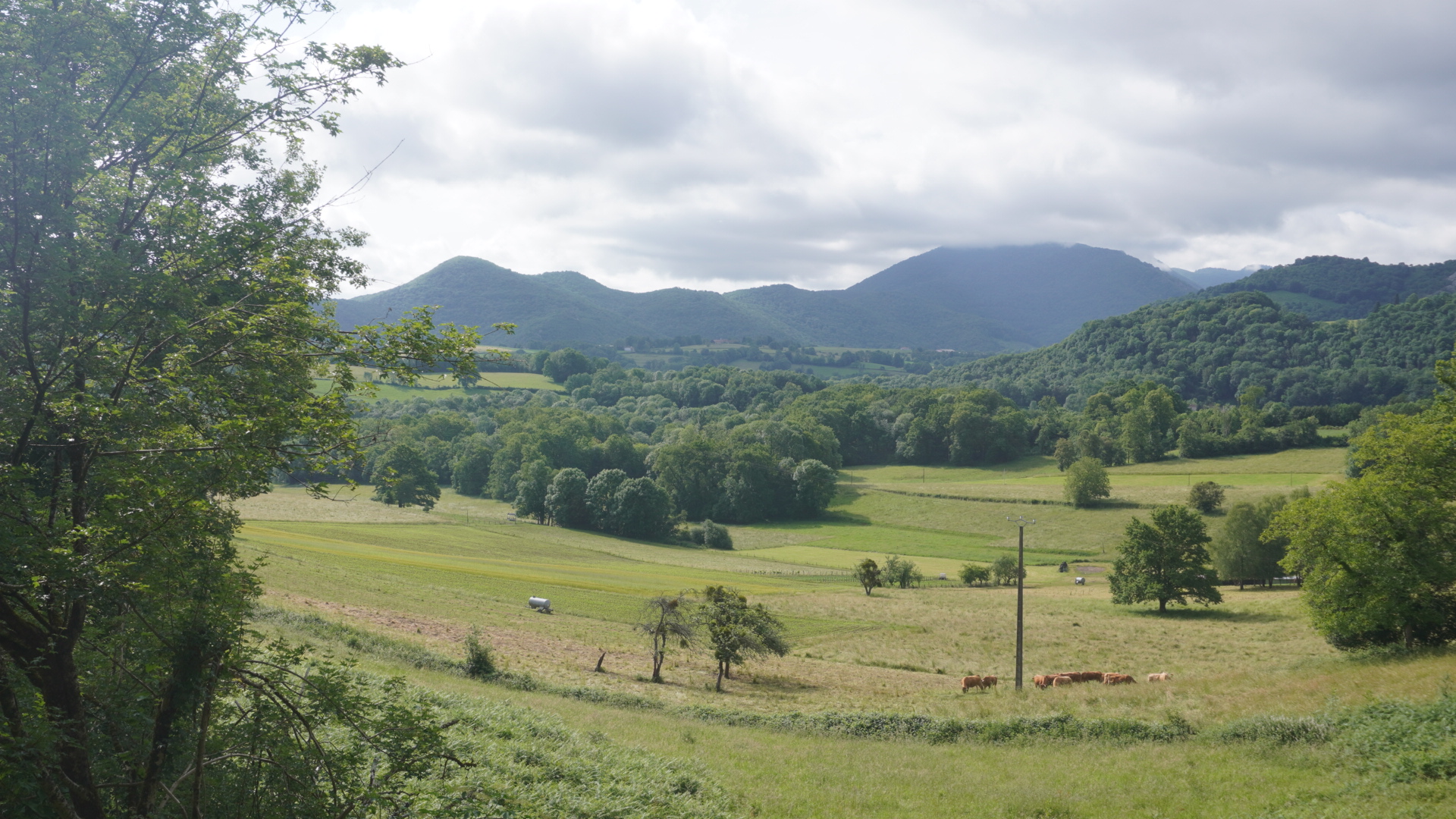Der Blick nach rechts (Süden) zeigt leider immer noch nicht den grandiosen Pyrenäen-Blick, den ich auf dieser Tour erwartet habe. Immerhin haben sich die Wolken weiter zurückgezogen, die Gipfel sind aber noch nicht frei. Dafür ist das Radfahren hier herrlich, insbesondere die sechs Kilometer abwärts durch das Tal des Nistos.