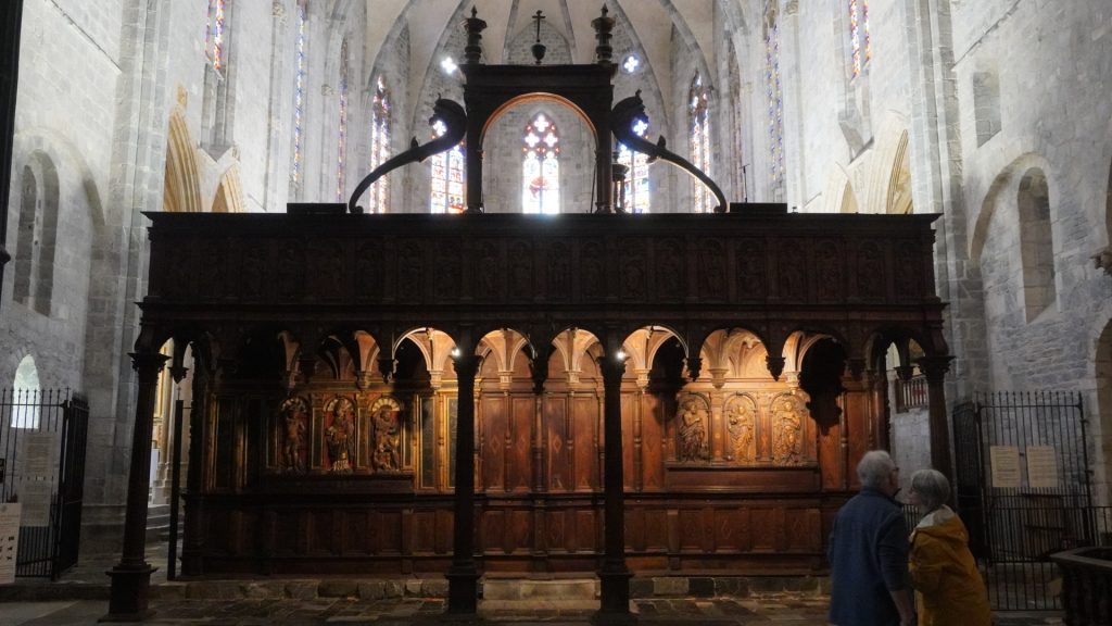 Im Innenraum beherbergt sie ein merkwürdig anmutendes, rundum geschlossenes und kunstvoll geschnitztes Chorgestühl aus Eichenholz, das im 16. Jahrhundert erstellt wurde, um den Klerus vom Pöbel zu trennen. Vornehm ausgedrückt, um die Intimität der Kanoniker von der Masse der Pilger zu trennen, die damals auf dem Weg nach Santiago de Compostela hier Station machten. Was es allerdings mit dem Krokodil an der Säule auf sich hat, konnte ich nicht in Erfahrung bringen.