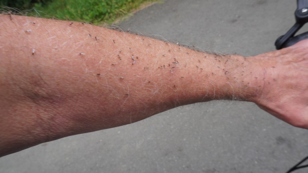 Und während ich so mit 25 km/h auf einsamen Wegen dahinfliege, fliegen mir auf einmal Schwärme von Gewittertierchen in den Weg. Wie ein intensiver Sprühregen dringen sie auf mich ein! Da hilft nur: Augen zu und durch. Ach ja und Mund zu natürlich auch, sonst bin ich bald überproteiniert! Es ist unglaublich, wie schnell die sogar unter meinem Trikot sind! Immer wieder muss ich stehen bleiben, um sie von den Klamotten zu schütteln und von der Haut abzustreifen.