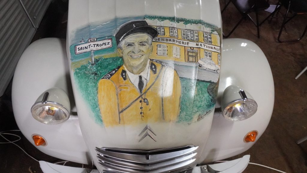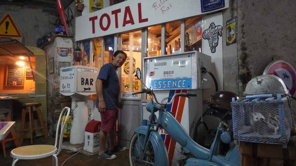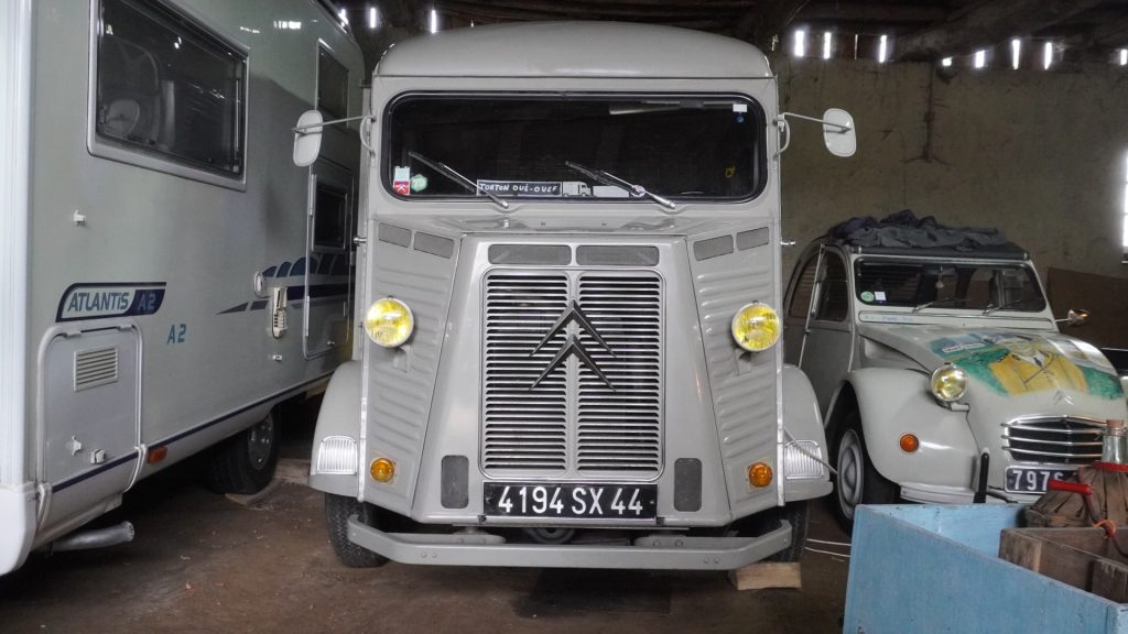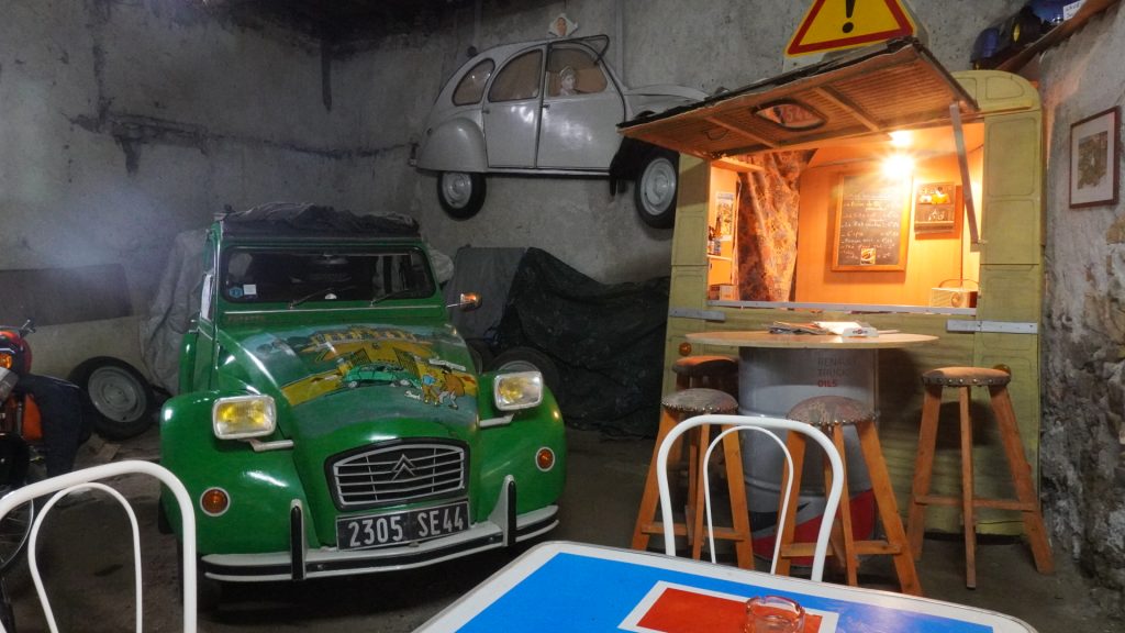 Pierre, mein heutiger Vermieter hat ein Hobby: Citroen. In seinem Schuppen stehen zwei 2CVs, individuell lackiert mit Louis der Funès bzw. Tintin (Tim und Struppi) und ein Typ H (das ist der kantige Wellblech-Transporter); dazu noch Teile als Bar oder Wandschmuck und eine alte Total-Tankstelle. Sehr kultig!