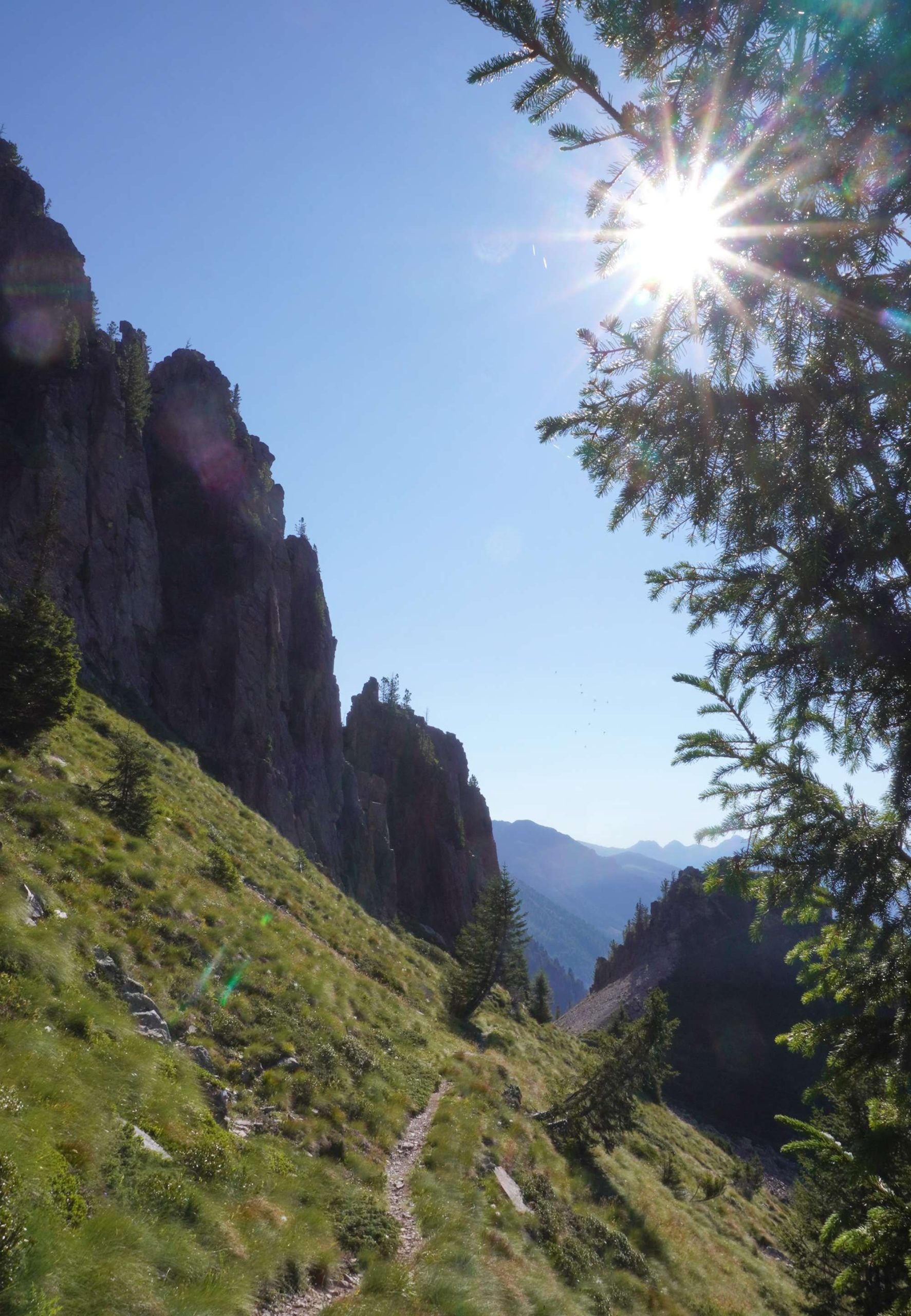 Auf einmal biegt der Weg um eine Ecke und ich laufe unter wunderschönen rötlichen Porphyr-Felsen entlang, einem Eruptivgestein, aus dem die ganze Lagoraikette aufgebaut ist.