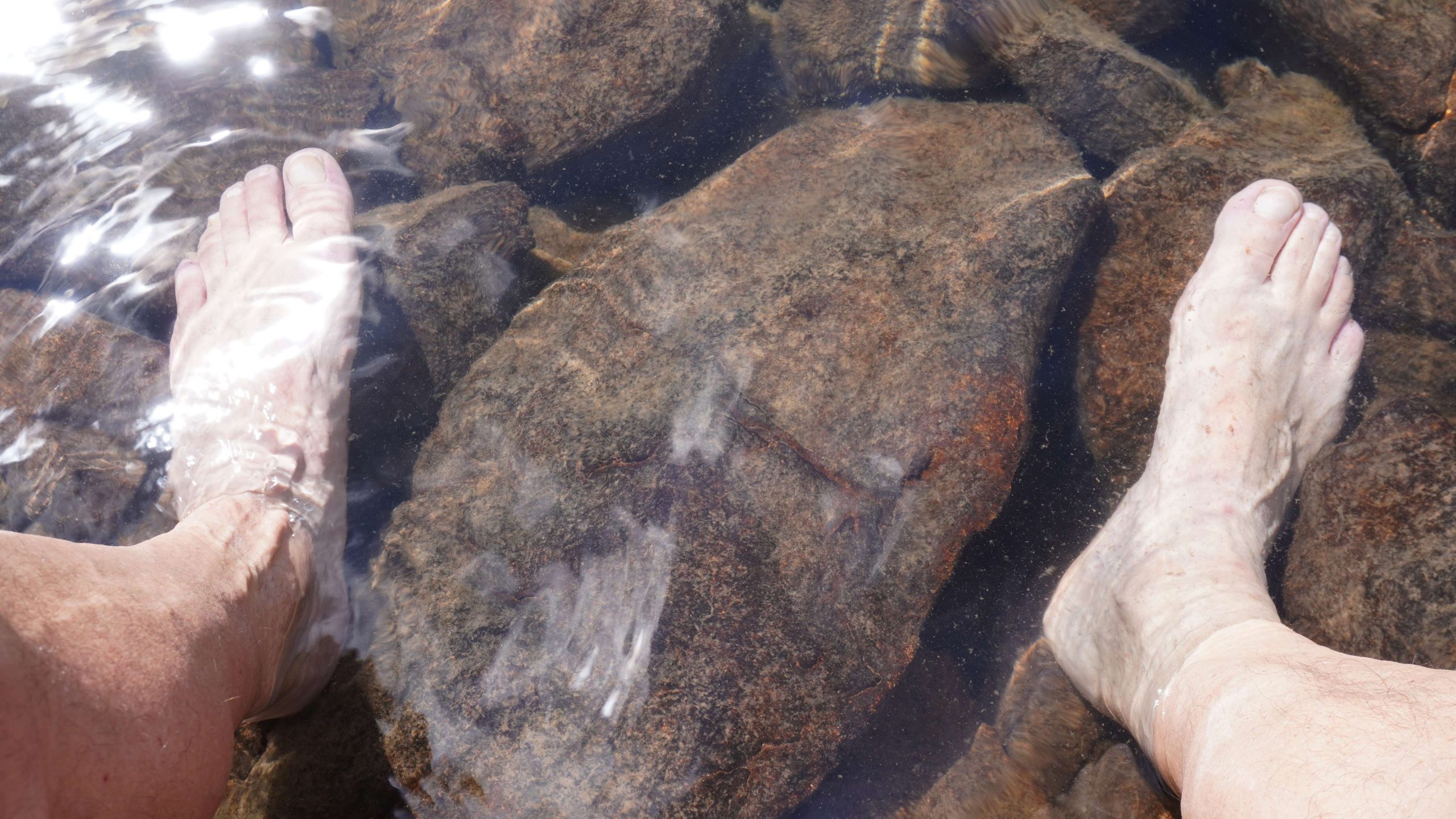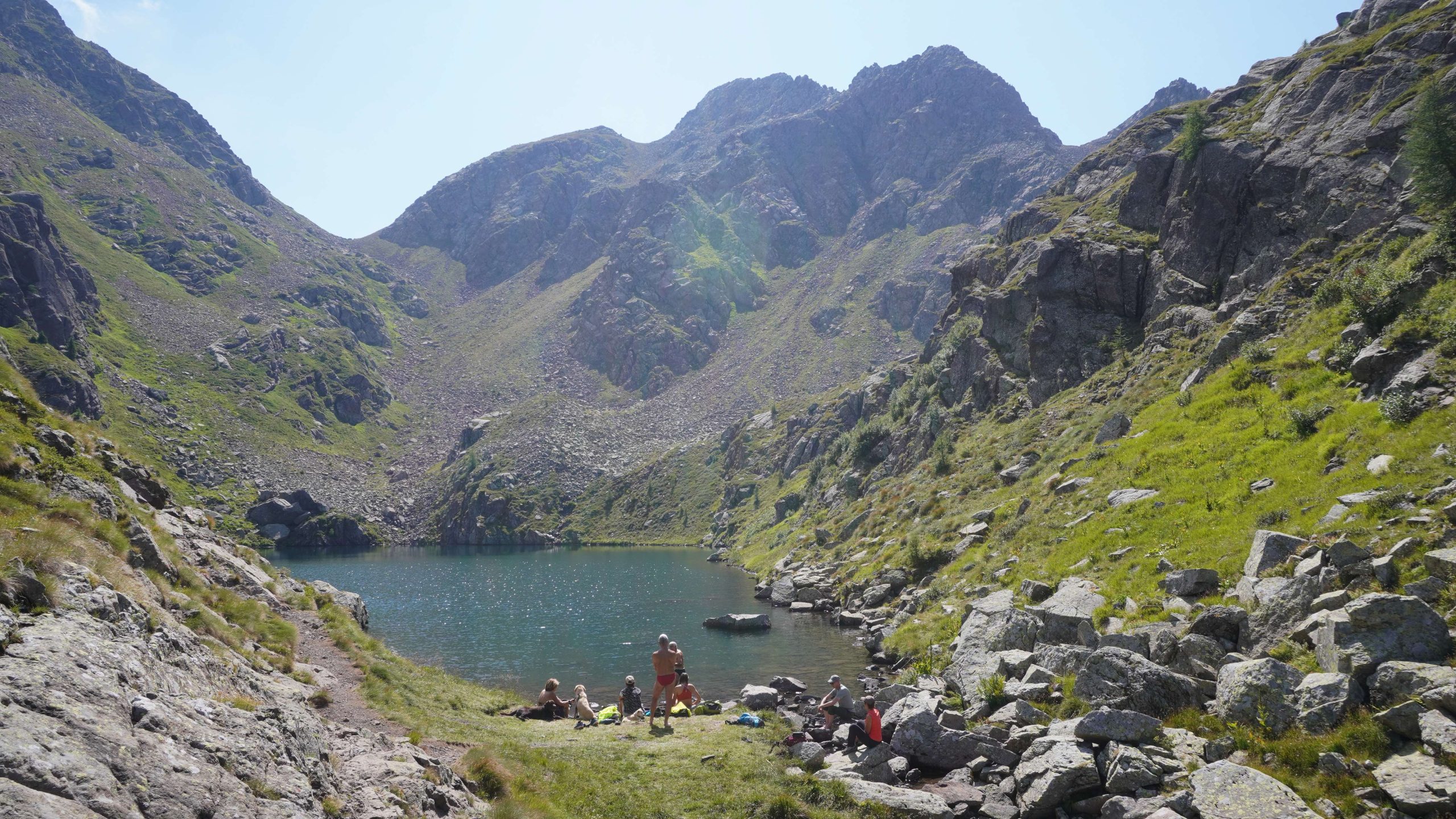 An einem See mache ich Mittagspause – nicht als Einziger, viele aus einem der Seitentäler aufgestiegenen Tagesausflügler haben ihn als Ziel auserkoren. Die besten Plätze sind schon vergeben. Aber ich finde noch einen Sitzstein für mich, von dem aus ich die Füße im Wasser kühlen kann.