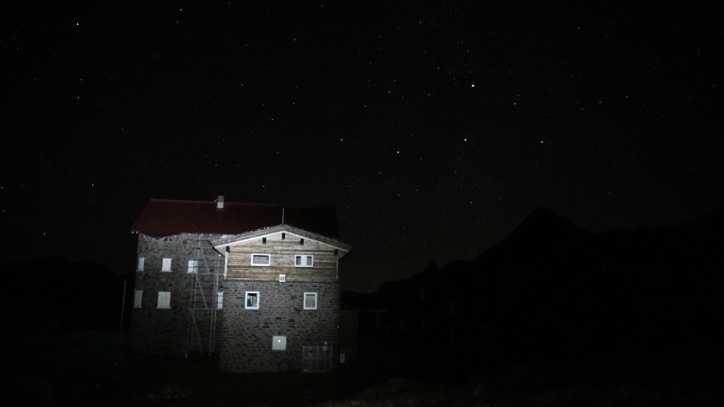 In der Nacht muss ich raus – das Klo ist außerhalb. Der kalte Wind tobt sich inzwischen woanders aus, die Wolken sind verschwunden, unzählige Sterne stehen am Himmel. Zwischen Haupt- und Wintergebäude der Hütte verläuft die Milchstraße, im Osten steht der Orion.
