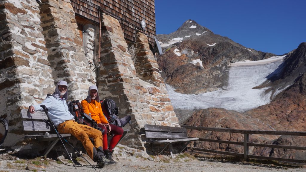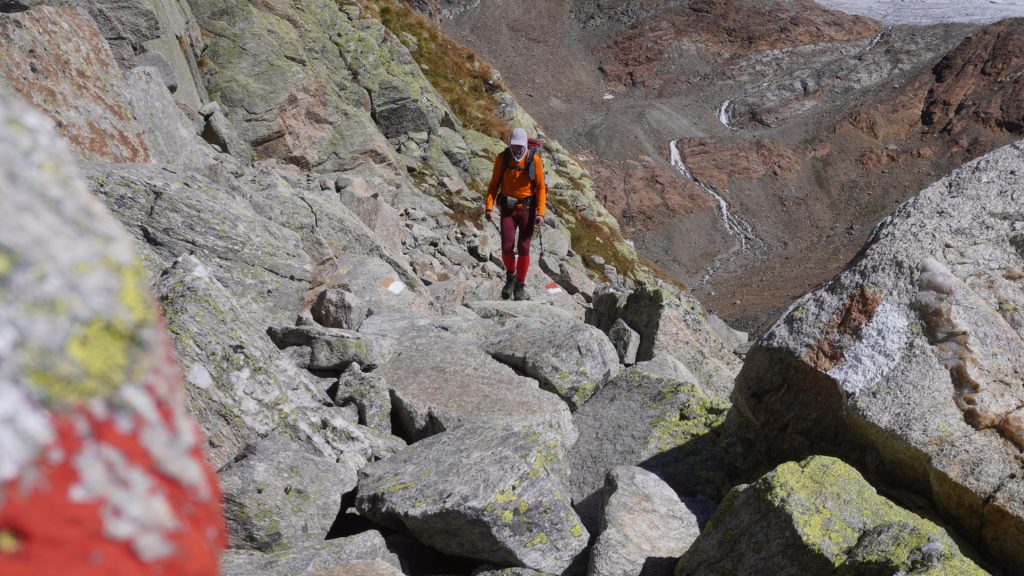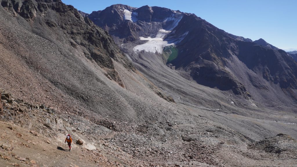 Nach Norden hin sehen wir die Ausläufer des Stubaier Skigebietes und im Nordwesten, nur einen guten Kilometer Luftlinie entfernt, die Hildesheimer Hütte. Bis dahin geht es aber nochmal 250 Meter steil hinunter und dann wieder 150 Meter steil hinauf – natürlich durch Moränen und Blockfelder.