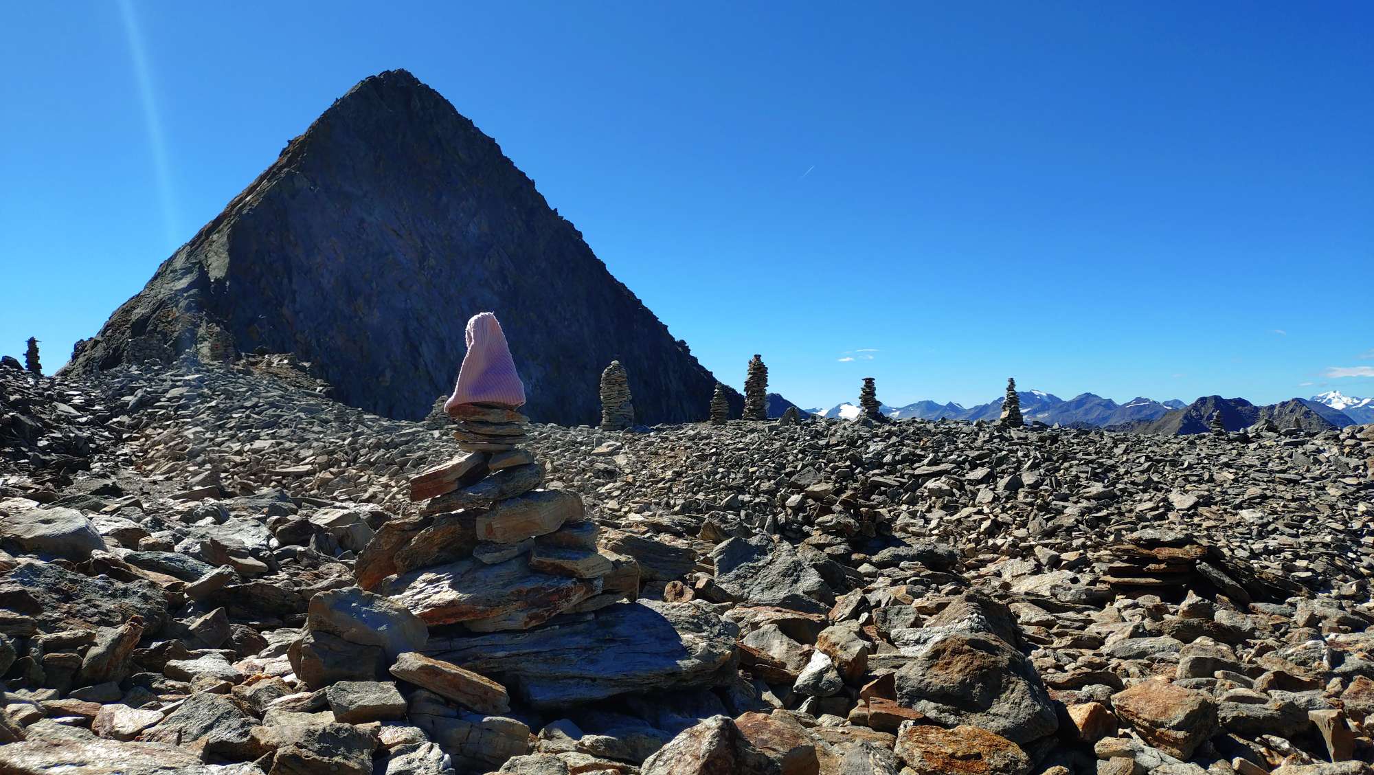 Das Gamsplatzl entpuppt sich als Sammelplatz für Steinmännchen, eins hat sogar eine Mütze auf. Am größten machen wir Pause.