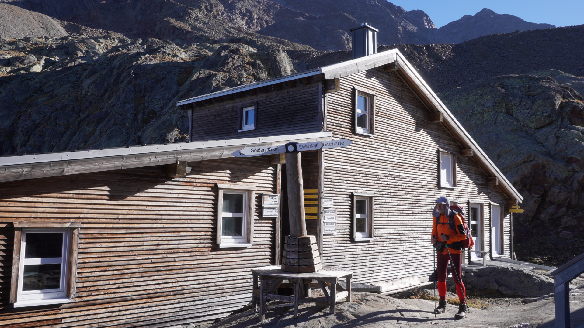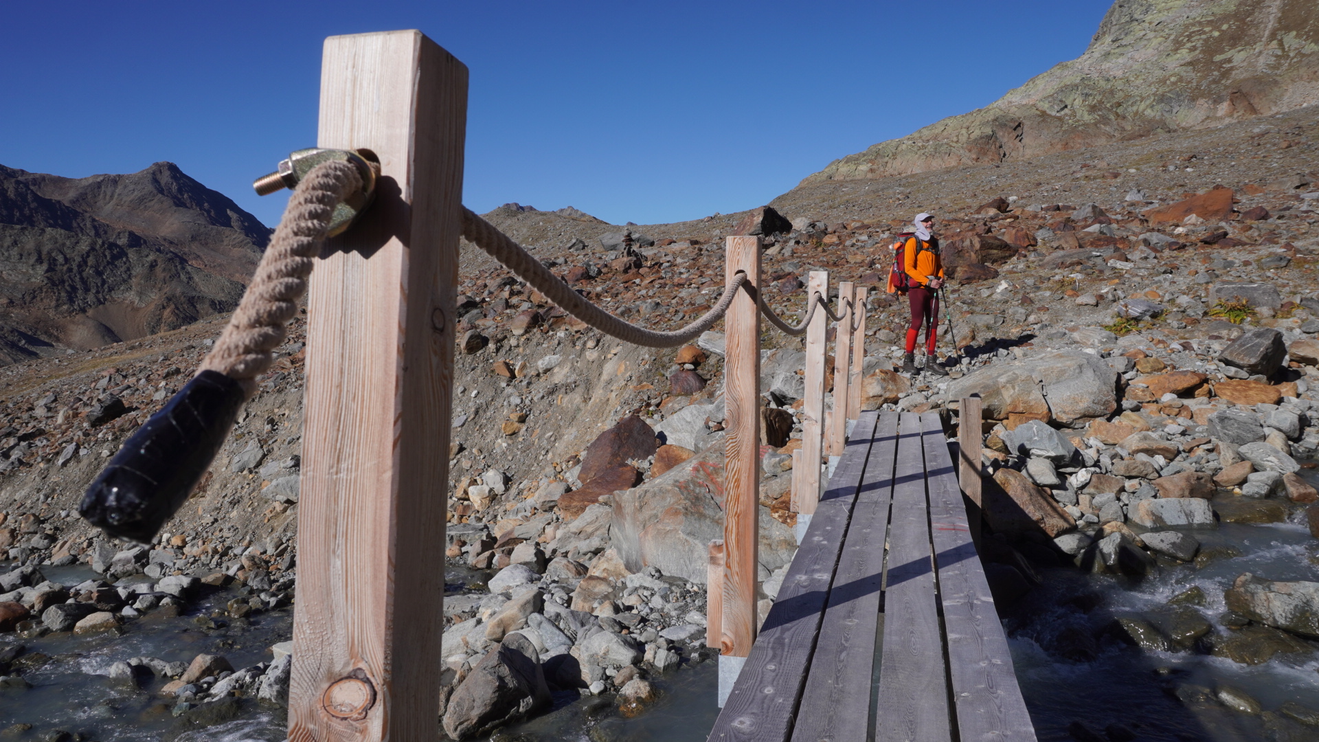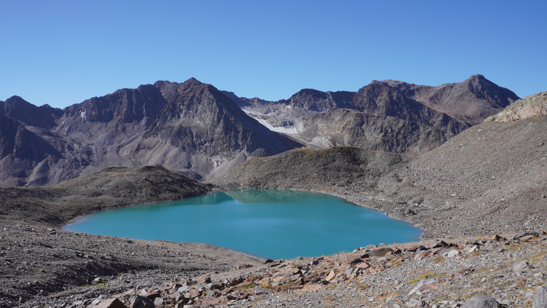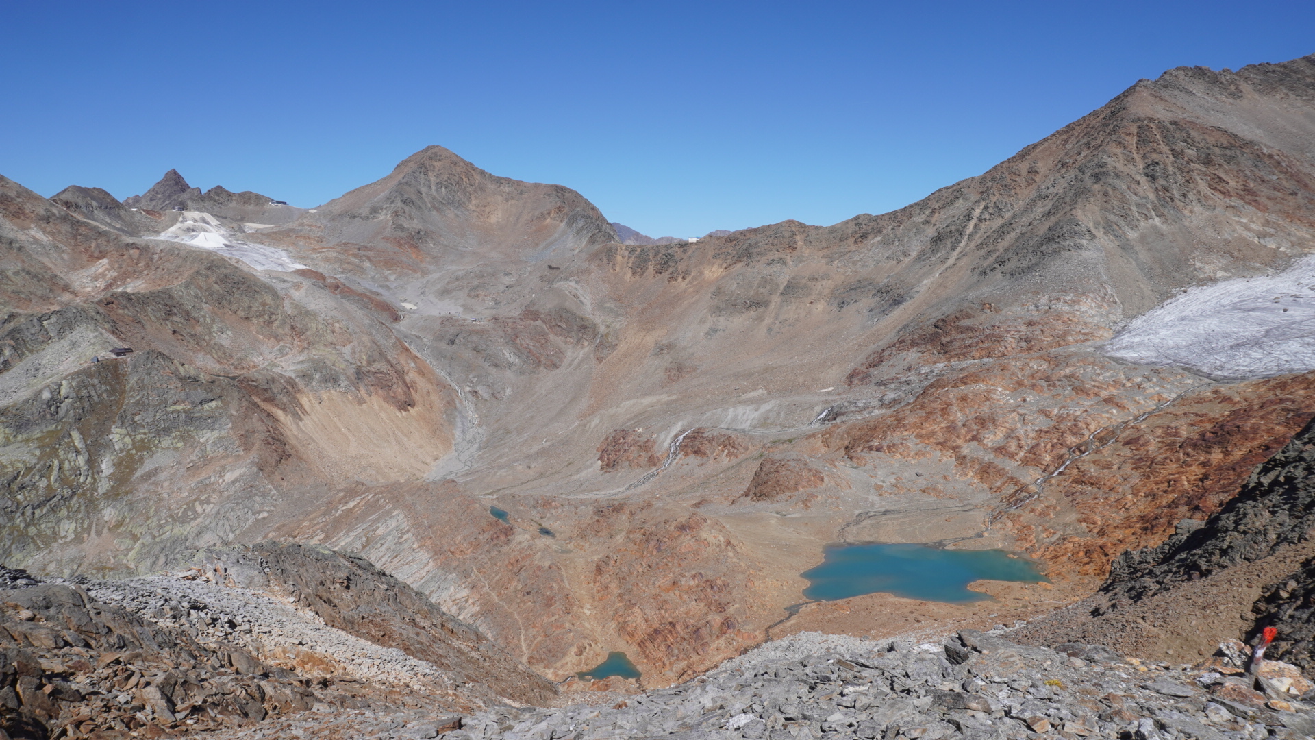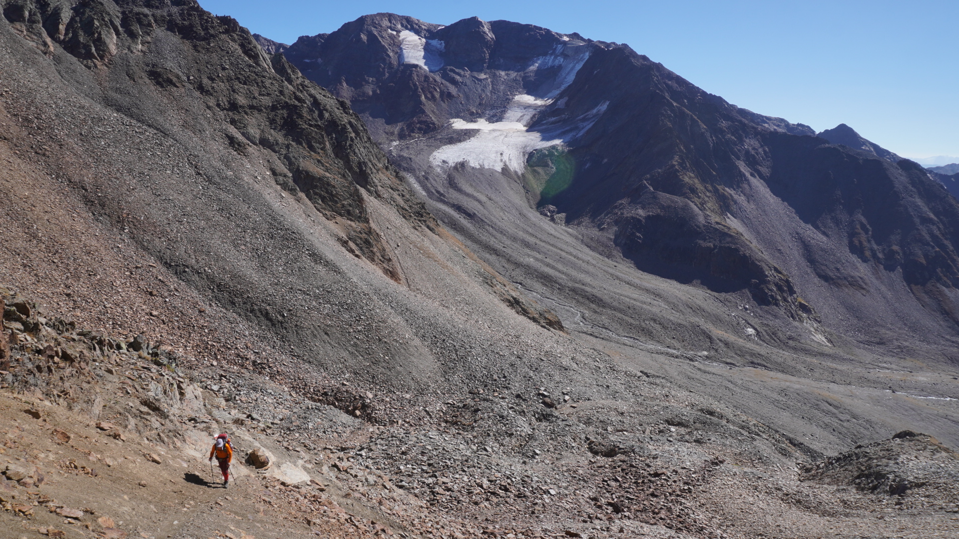Nach Norden hin sehen wir die Ausläufer des Stubaier Skigebietes und im Nordwesten, nur einen guten Kilometer Luftlinie entfernt, die Hildesheimer Hütte. Bis dahin geht es aber nochmal 250 Meter steil hinunter und dann wieder 150 Meter steil hinauf – natürlich durch Moränen und Blockfelder.