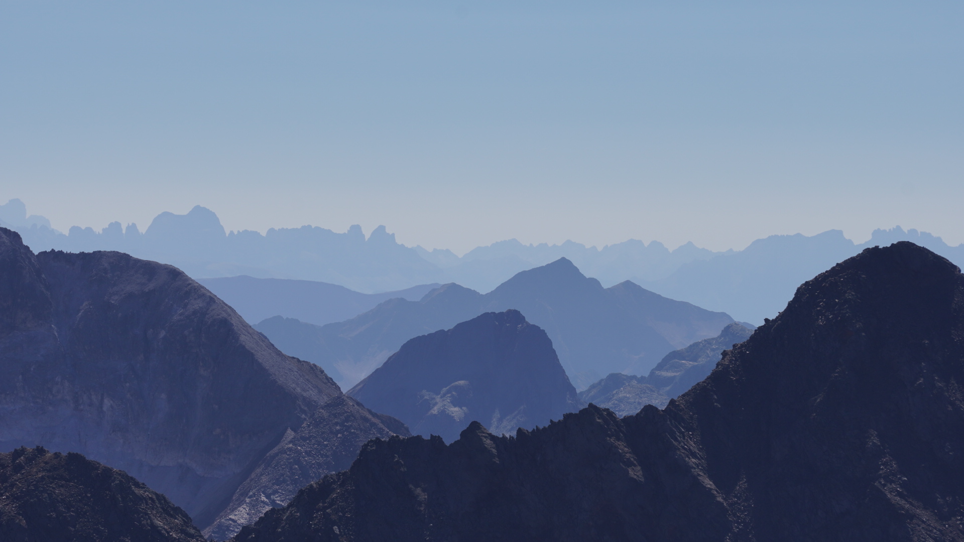 Was für ein Wetter heute: pure Sonne. Und was für eine Fernsicht! Im Süden sind die Dolomiten zu erkennen, dominant die Rosengartenspitze, weiter westlich statt der Lagorai, den ich vor einem Monat durchquert habe.