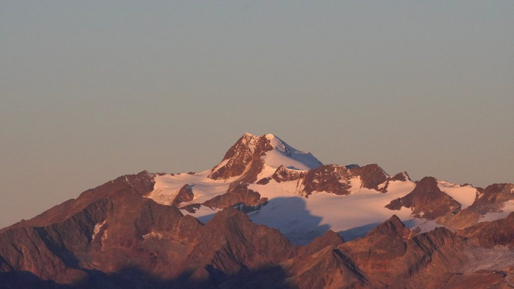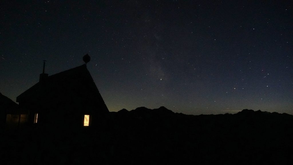Das zweite Nachtfoto-Experiment klappt schon besser. Bereits am Abend gelingt mir ein Foto, mit dem ich auch selber ganz zufrieden bin. Am Morgen stehen Naemi und Manuel, die am Vorabend noch hochkamen, schon früh auf und sind weg, bevor ich ein weiteres Foto- oder besser Film-Experiment starte: das Erstrahlen der Wildspitze im ersten Morgenlicht im Zeitraffer.