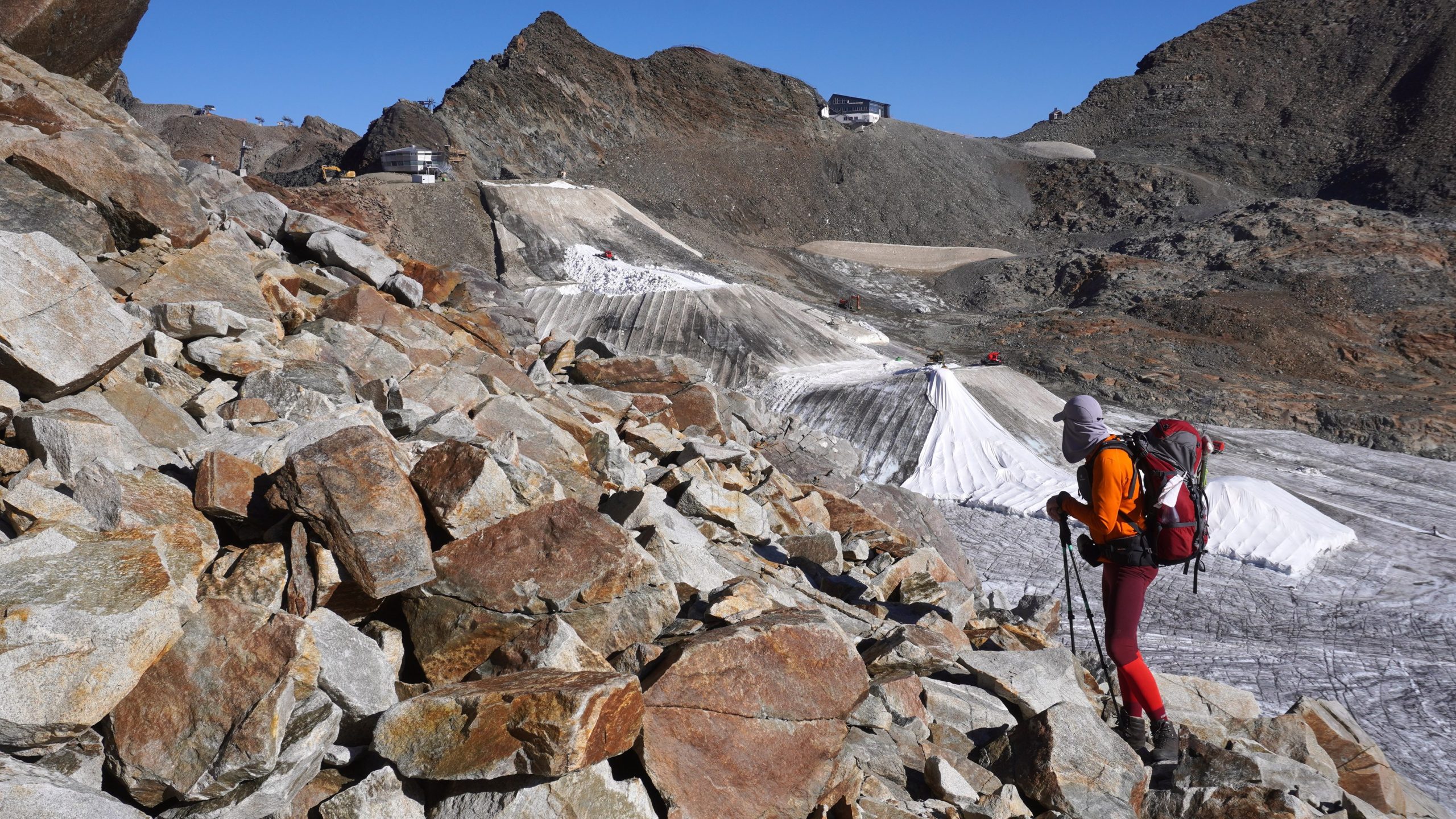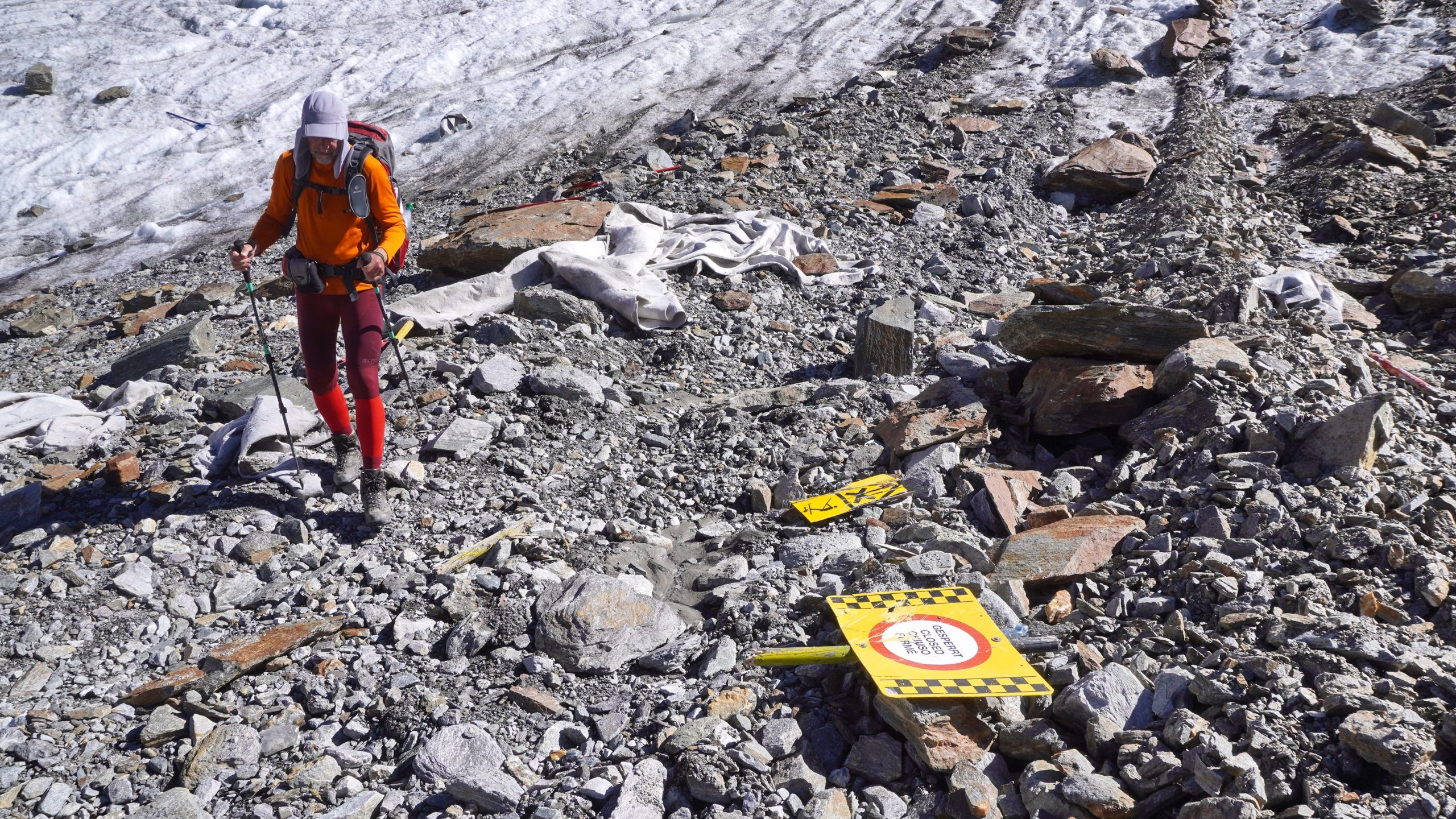 Dann sind wir auf der Jochdohle, mitten in der Skigebiet-Baustelle, müssen eine Piste hinunter, auf einen weiteren Restgletscher, den Windacher Ferner, den wir queren und bis an sein Ende absteigen. Hier liegt jede Menge Müll herum: Skipisten-Wegweiser, Markierungsstangen, Plastikplanen, etc., die nie jemand wegräumen wird.