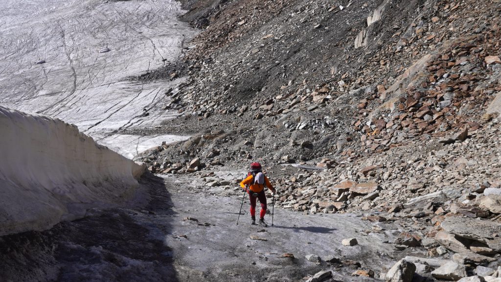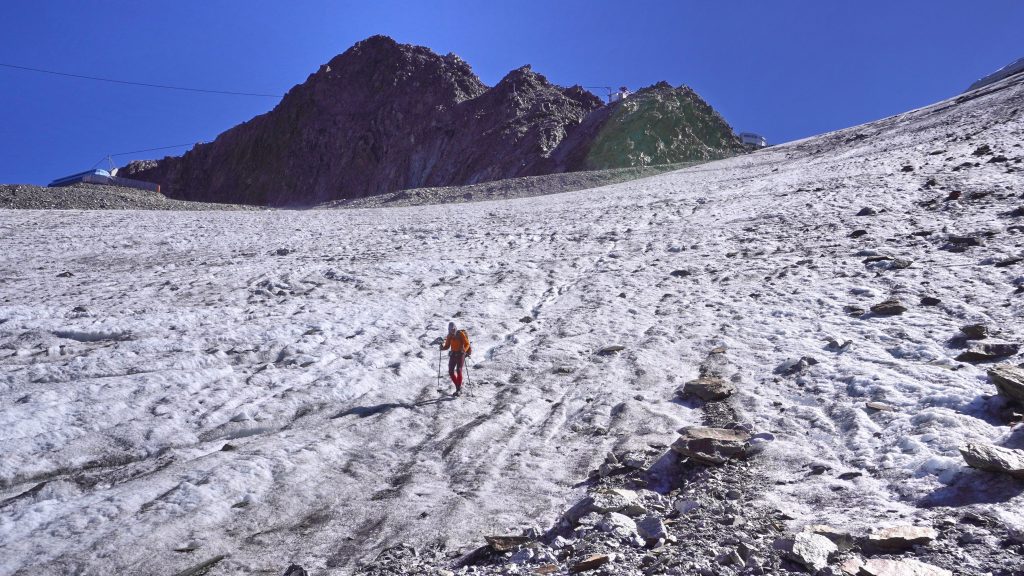Vom Grat des Schussgrubenkogels steigen wir über steilen Schutt und Blockgelände zum Gletscher ab und laufen an seiner linken Seite hoch bis an sein Ende. Hier wechseln wir nach links in eine Abraumhalde, die die Bodenbewegungen fürs Skigebiet erzeugt hat. Echt nicht empfehlenswert! Und dabei passiert es: bevor ich die Halde erreiche, rutsche ich trotz der Microspikes unter meinen Schuhen weg, Leo entgegen, der wenige Meter unter mir steht.