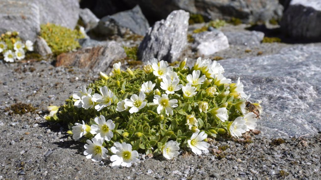 Über Felsen steigen wir zur Jochdohle auf. Hier stehen wir dem westlichen Ende des Stubaier Gletscherskigebiets gegenüber. So wie man anderen Orts Autobahnen in die Landschaft baut, sind hier Pisten ins Gelände trassiert worden. Der Schnee der letzten Saison liegt noch in Geländestufen aufgetürmt, von denen gerade die Abdeckplanen abgezogen werden, die verhindern sollten, dass er über den Sommer schmilzt. Dann wird er mit Baggern und Pistenwalzen verteilt, um die Grundlage für die nächste Saison zu bilden.